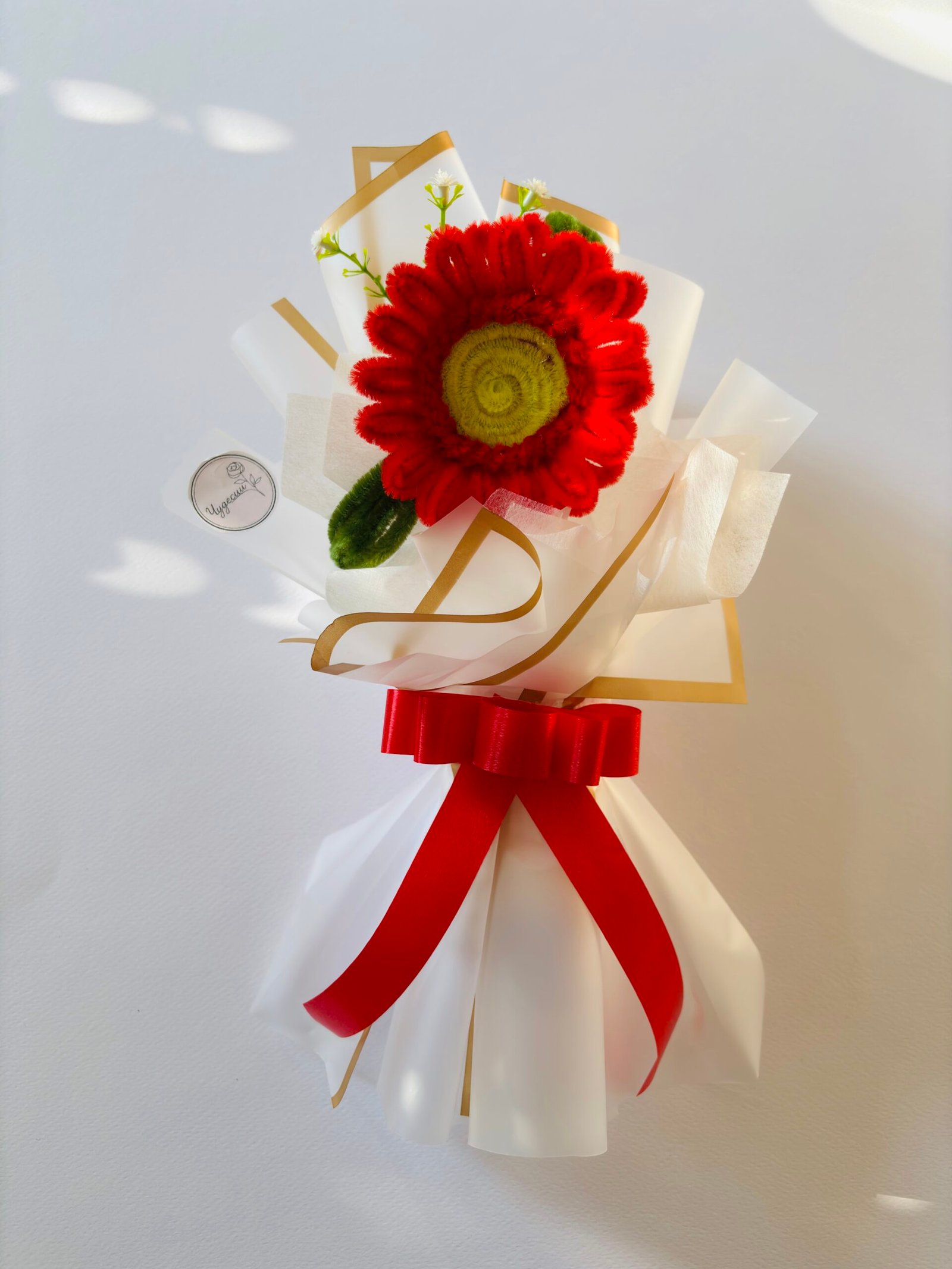 Този ръчно изработен букет е елегантен и запомнящ се подарък за всеки повод. В центъра му е поставено голямо, нежно цвете, заобиколено от деликатна аранжировка, която му придава обем и изискан вид. Букетът е опакован в стилни хартии и завършен с красива панделка. Той е идеален за подарък, който ще остане като траен спомен.