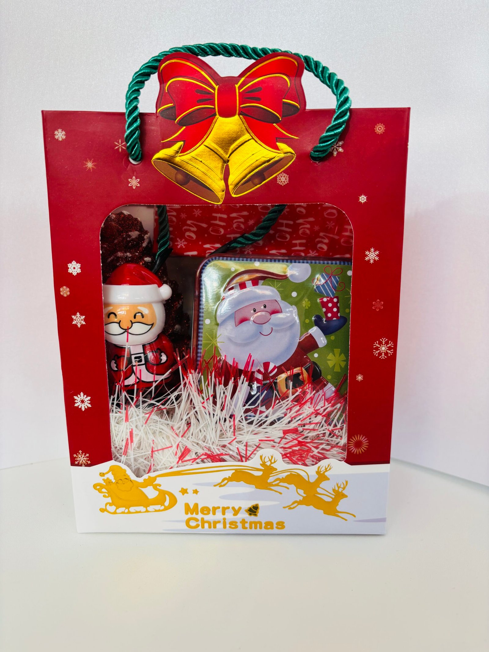 Този подаръчен пакет е пълен с класически коледен чар и включва перфектната комбинация от творчески материали, играчка и практичен елемент. Опакован е в стилна червена чанта с камбанки, готова да донесе празнично настроение.