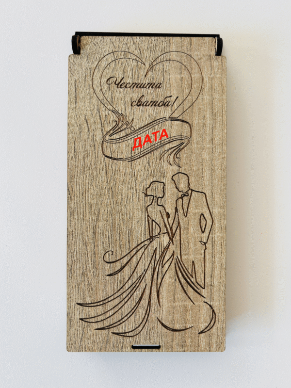 Тази елегантна дървена кутийка за сватба е изработена с внимание към всеки детайл и е идеалният начин да поднесете своя подарък за младоженците с финес и стил. На капака е гравирана нежна фигура на младоженци и надпис „Честита сватба!“, което я превръща в красив и запомнящ се спомен от специалния ден.