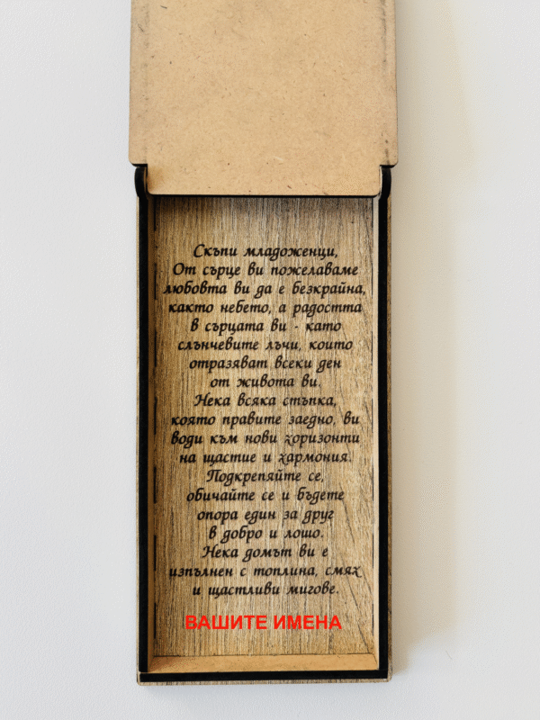 Вътрешната част на кутийката може да бъде гравирана с имената на хората, които подаряват – чудесен начин да оставите сърдечно послание или кратко пожелание.