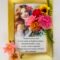 Предлагаме ви красива и оригинална картичка за рожден ден, поставена в елегантна рамка със златист кант. Отстрани на рамката има допълнителна украса от изкуствени цветя и зелени листа.