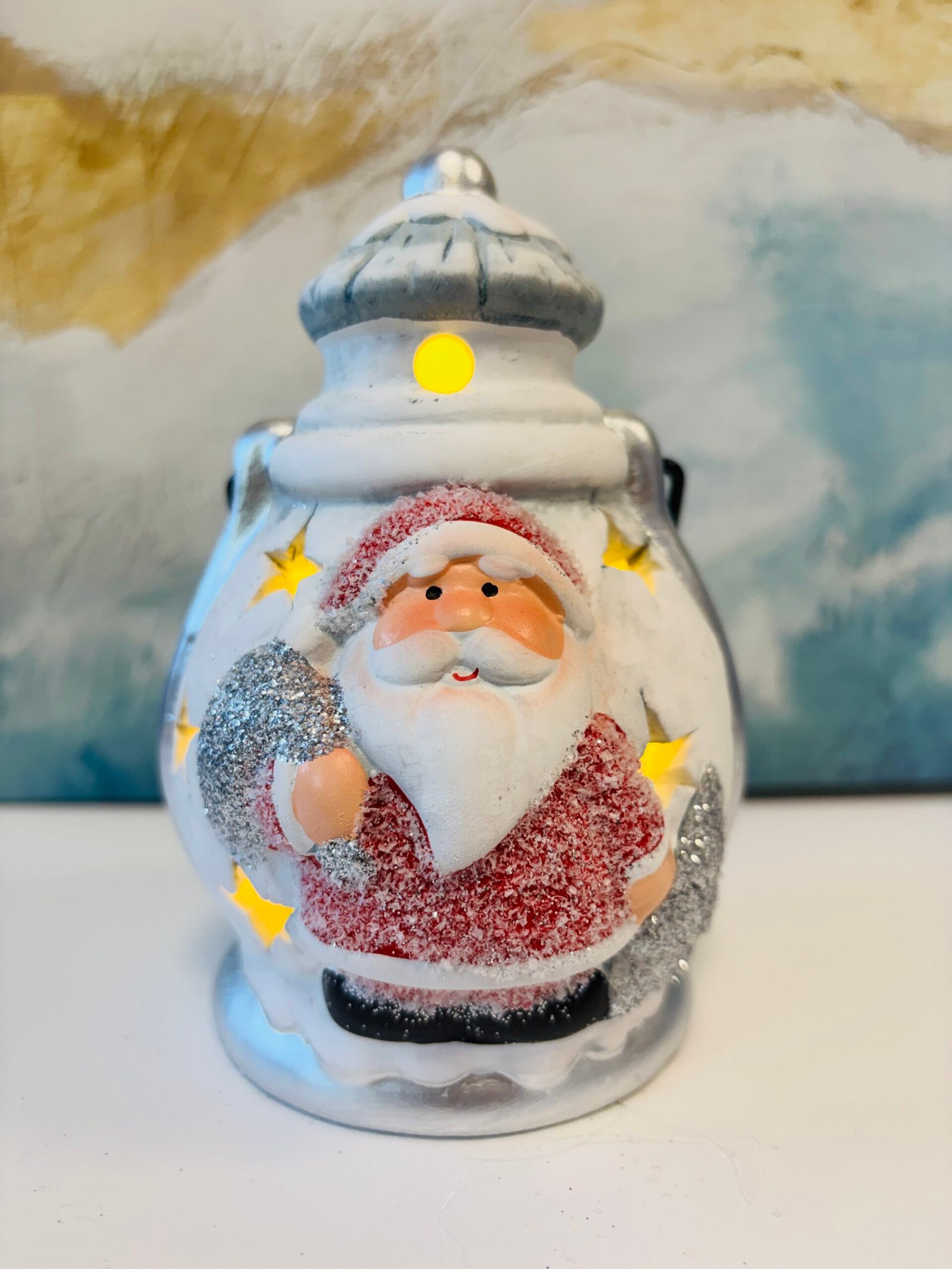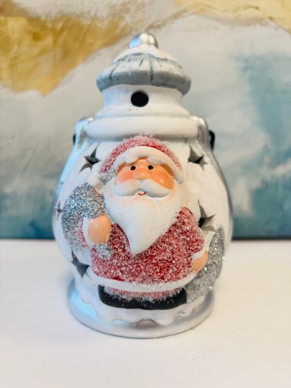 Този очарователен коледен фенер е чудесен начин да внесете празнично настроение в дома си. Изработен от керамика, той е с форма на буркан, върху който е изобразен весел Дядо Коледа, а отстрани има звездички, които светят. Целият фенер е покрит с бляскави частици, които му придават вид на заскрежен. Фенерът работи с батерии и излъчва топла светлина, която създава уютна атмосфера. Това е перфектен продукт както за празнична украса, така и за мил подарък.
