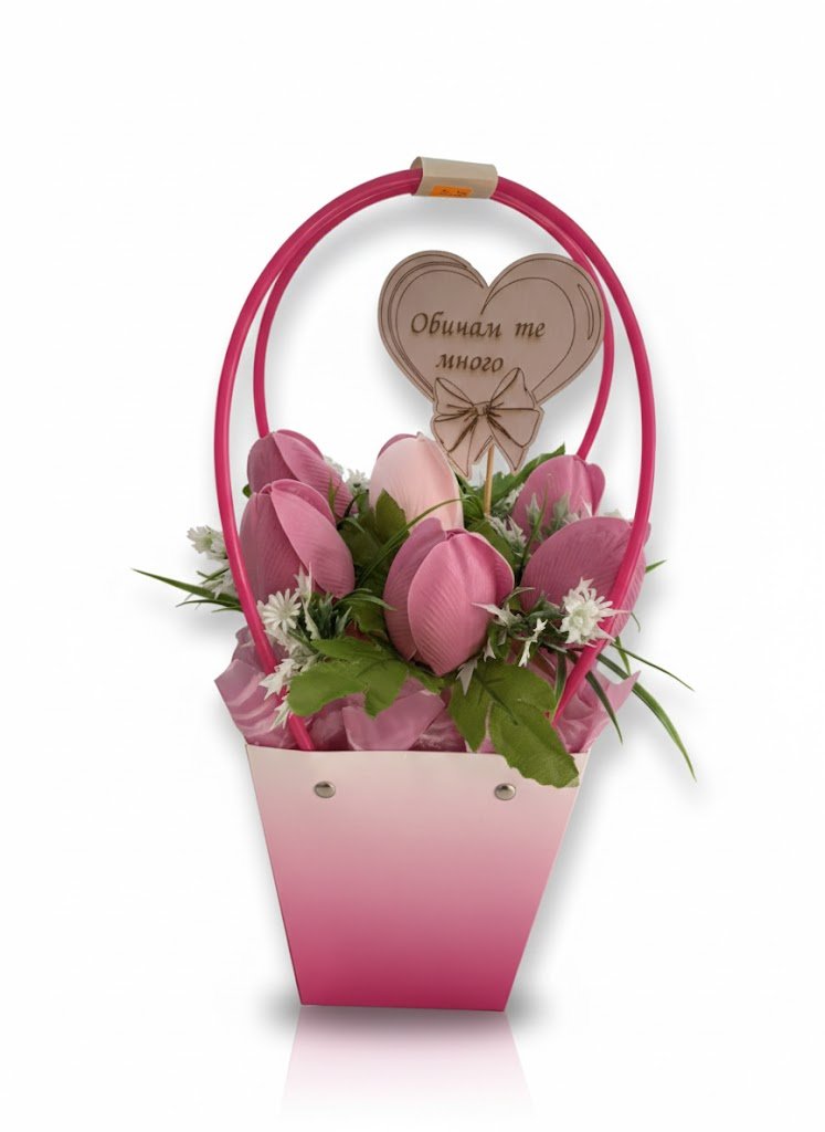 Подаръчна аранжировка в чантичка”Пухчета в Цикламено”