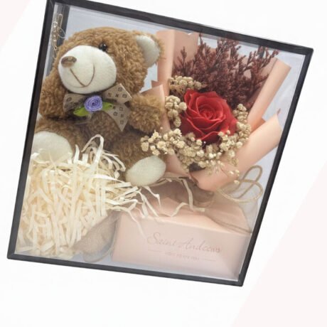 Подаръчен комплект с плюшено мече и букет от сапунена роза