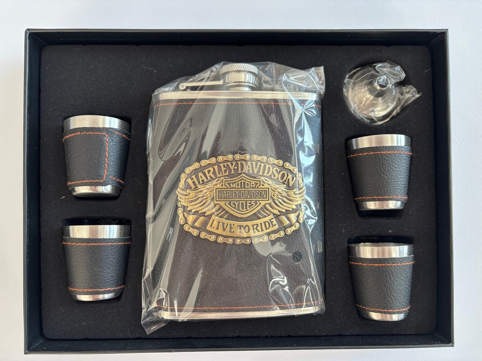 - Манерка от неръждаема стомана с покритие от изкуствена кожа, украсена с релефно метално лого на Harley-Davidson с надпис “Live To Ride”.