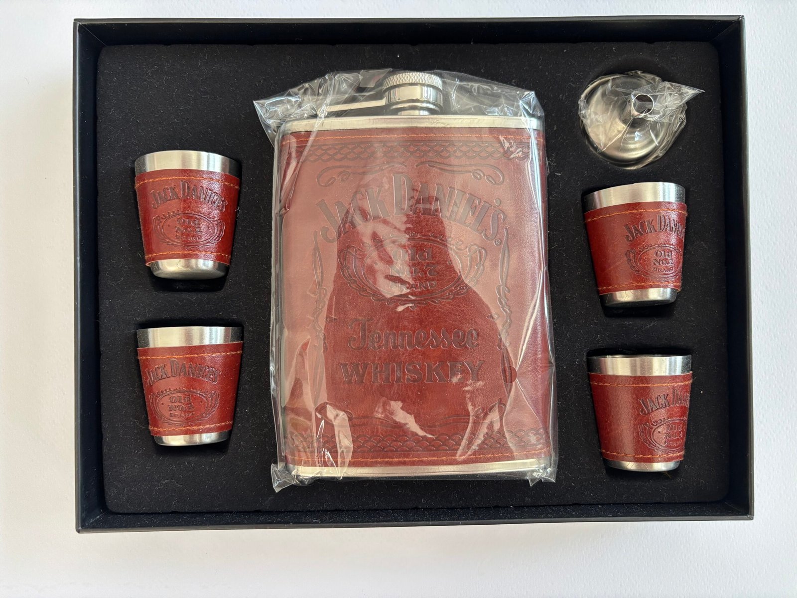 - Манерка от неръждаема стомана с покритие от изкуствена кожа в цвят тъмен кестен, украсена с релефно лого на Jack Daniel’s.
