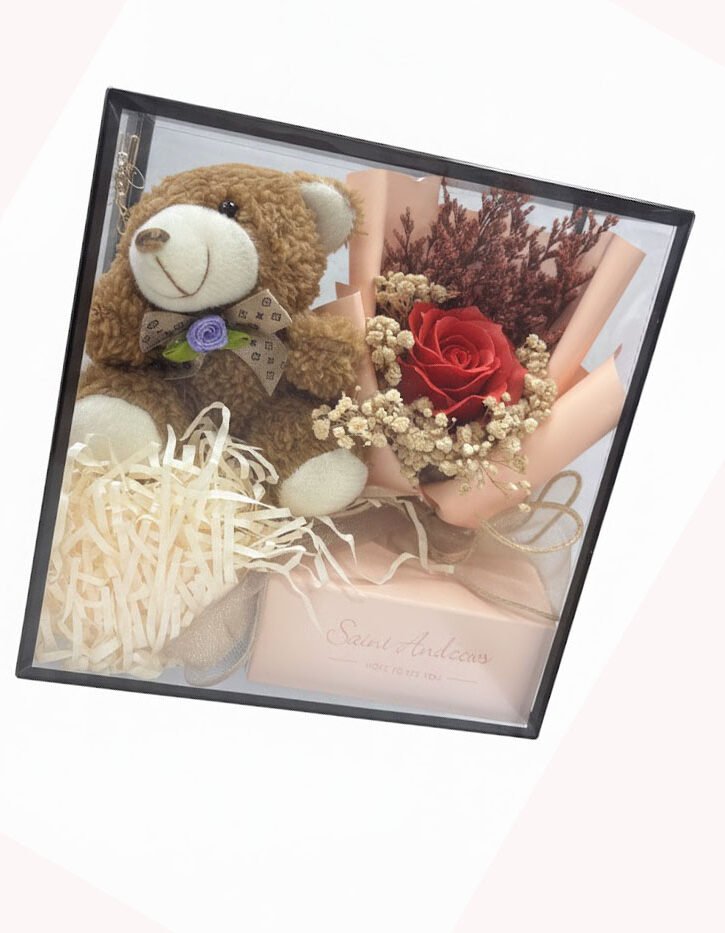 Подаръчен комплект с плюшено мече и букет от сапунена роза