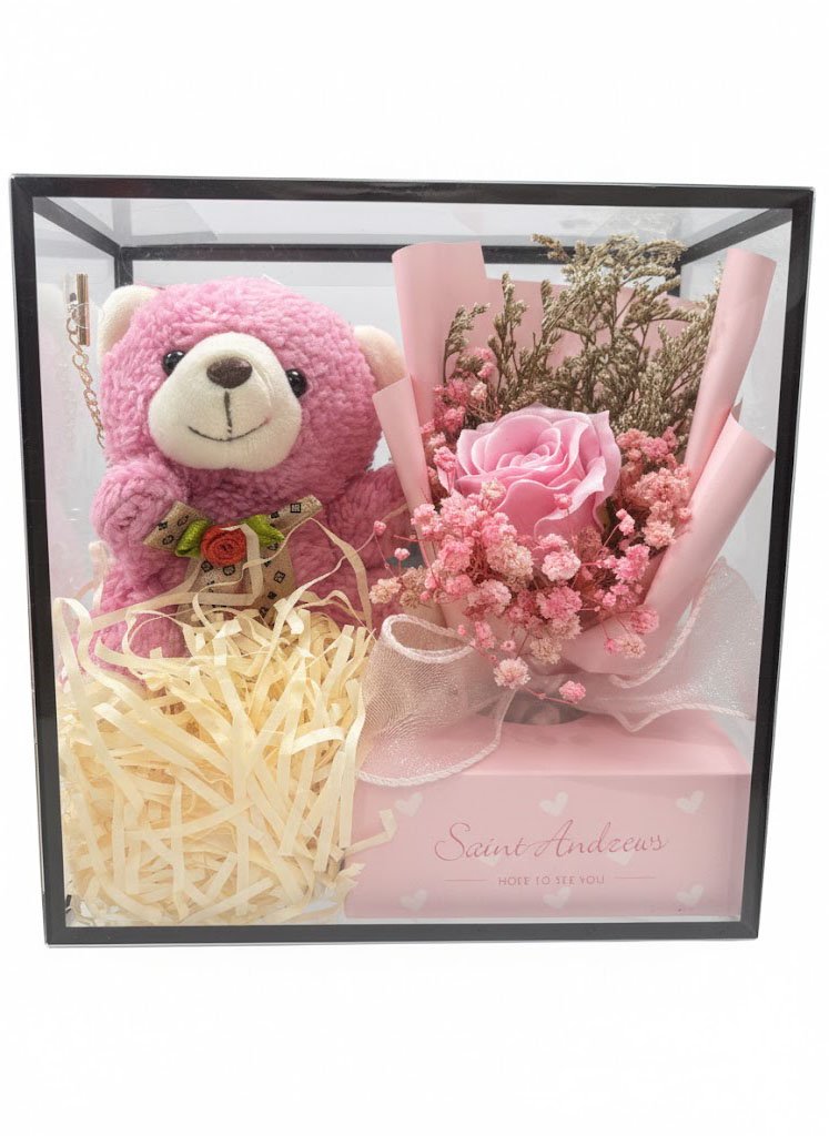 Подаръчен комплект с плюшено мече и букет от сапунена роза 2