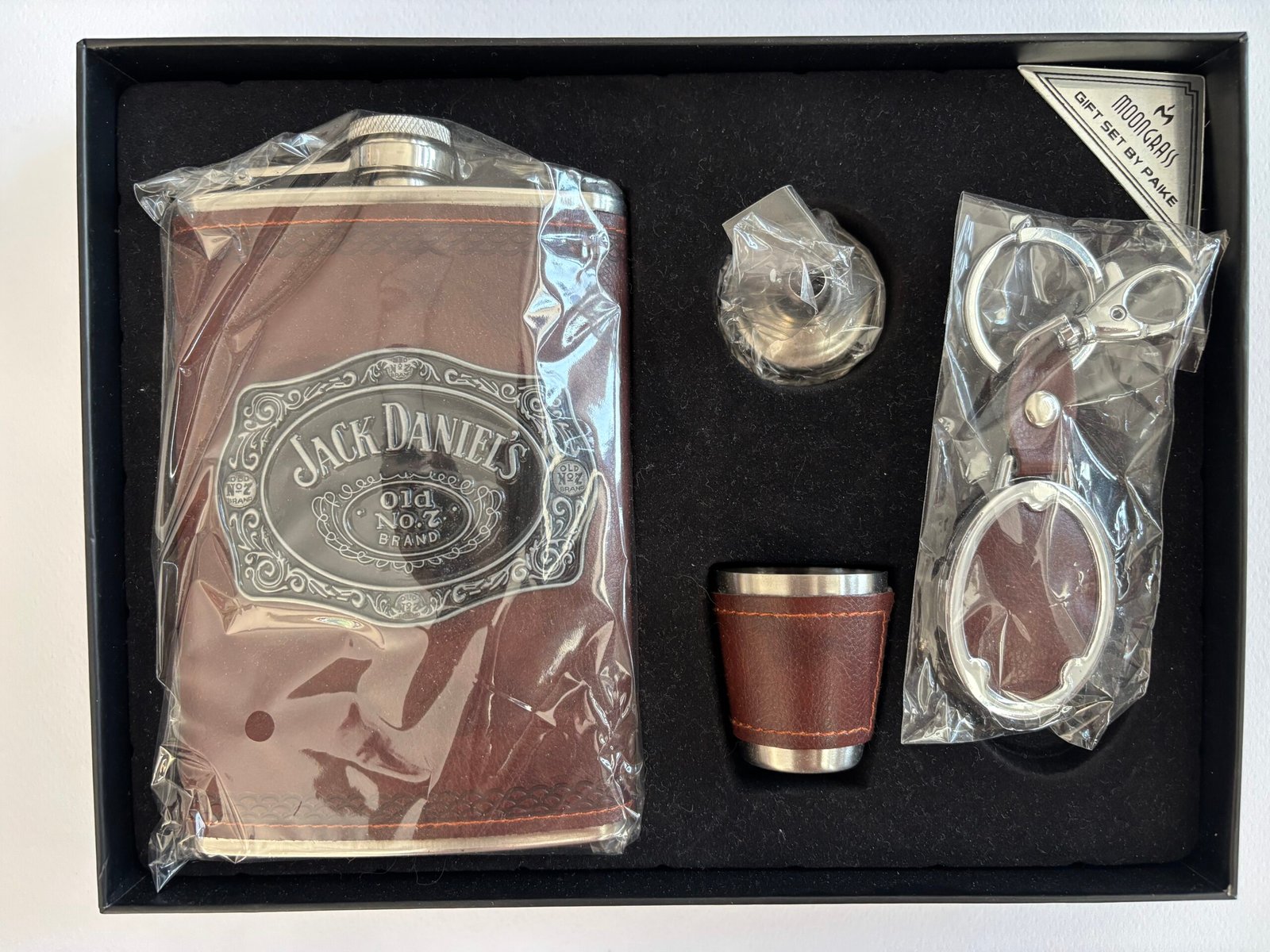 Този подаръчен комплект Jack Daniel’s® в цвят кафява кожа е елегантен и практичен избор за всеки любител на уискито.