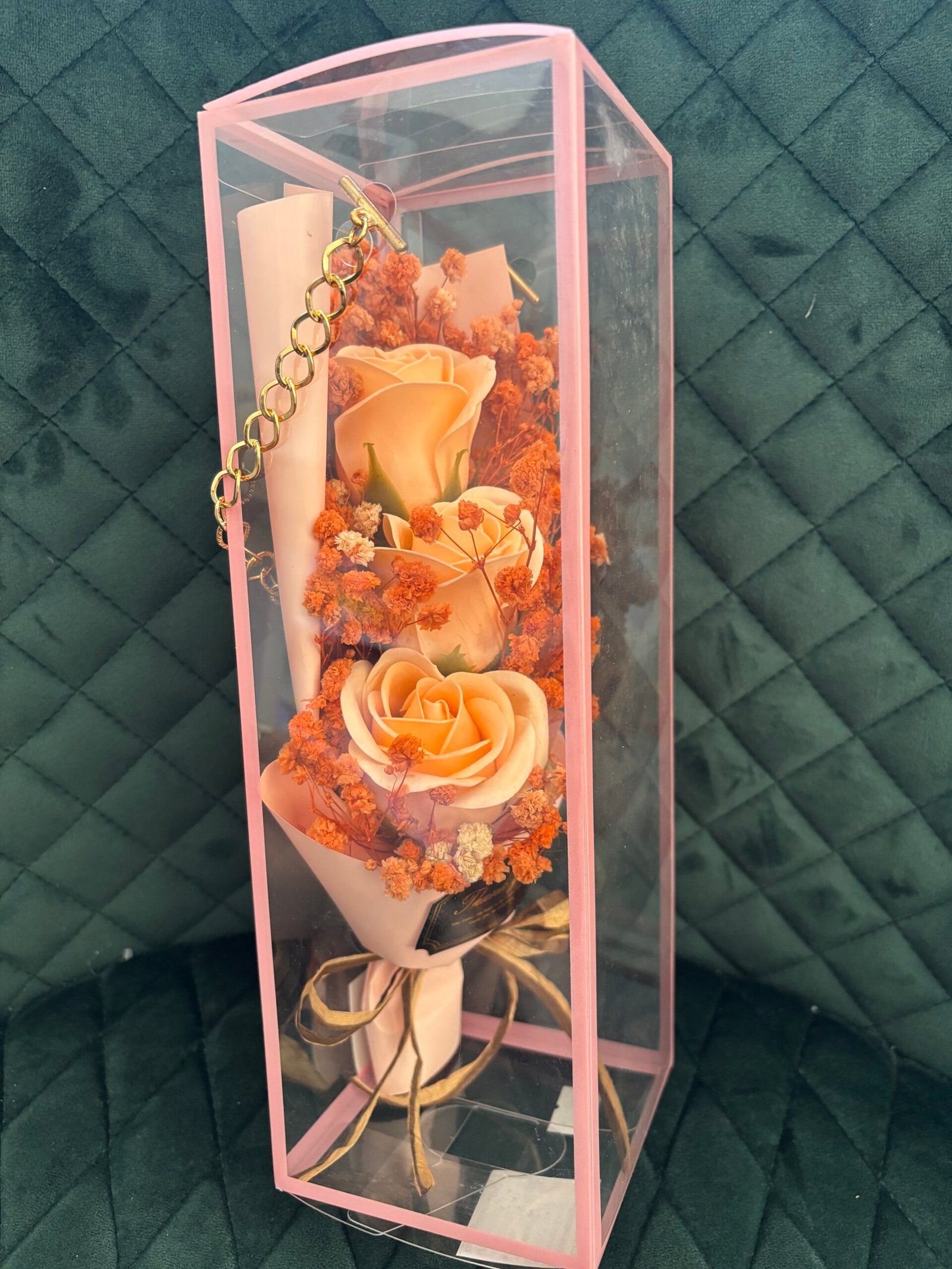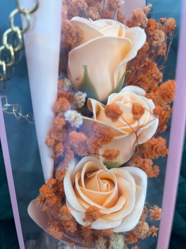 Букетът е деликатно аранжиран и опакован в стилна, прозрачна кутия с розов кант, която му придава модерен и луксозен вид. Прозрачните стени позволяват на красотата на розите да се разкрие от всеки ъгъл, докато ги предпазва и съхранява. За още по-голям шик, кутията е украсена с елегантна златна верижка, която служи като дръжка и добавя нотка разкош.