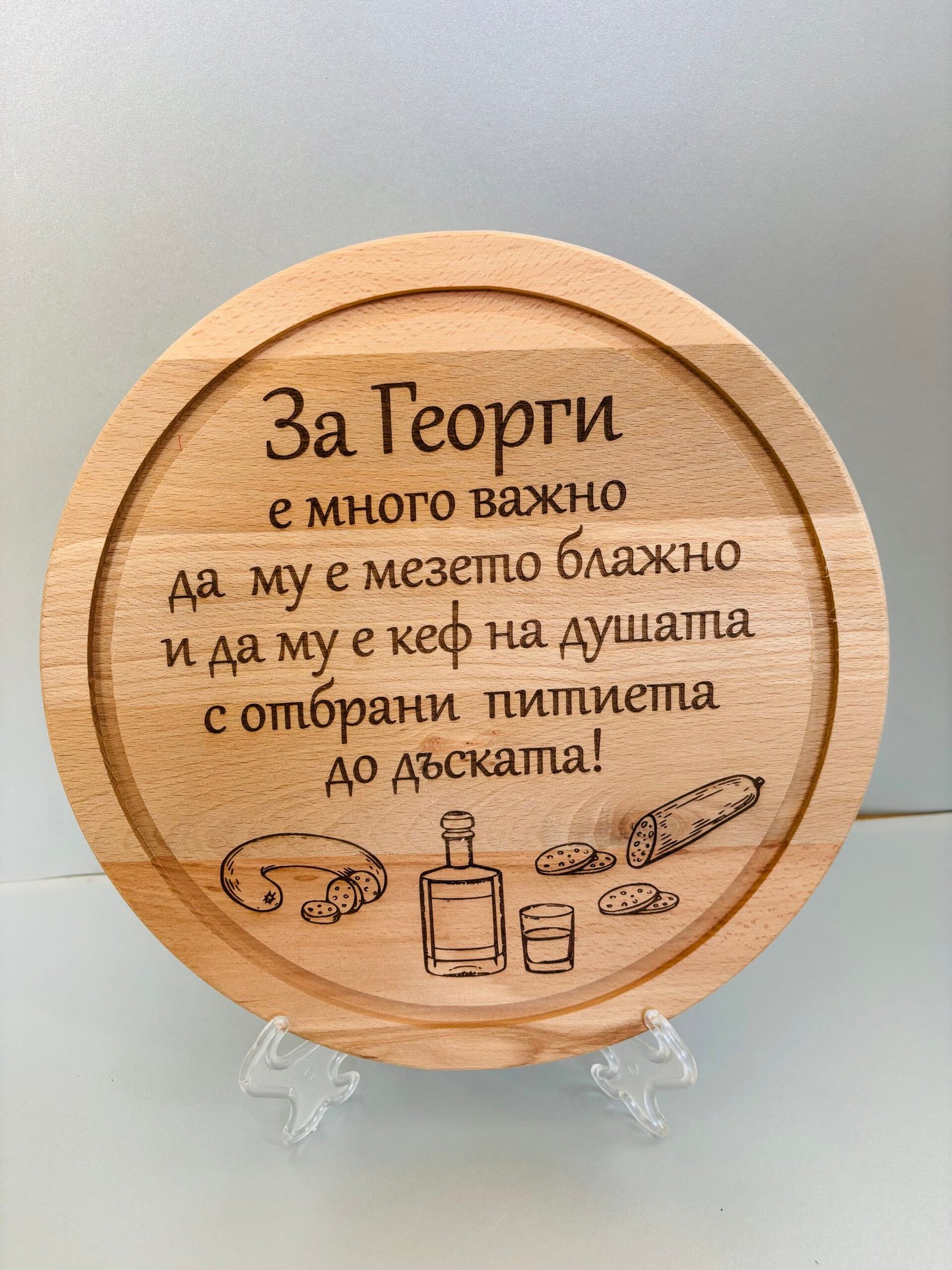 Подарете усмивка и топли пожелания с тази уникална дървена дъска, изработена от естествено дърво и украсена с красиво гравирано послание за имен ден. С илюстрация на бутилка, чаши и мезета, този подарък носи настроение и лично отношение.