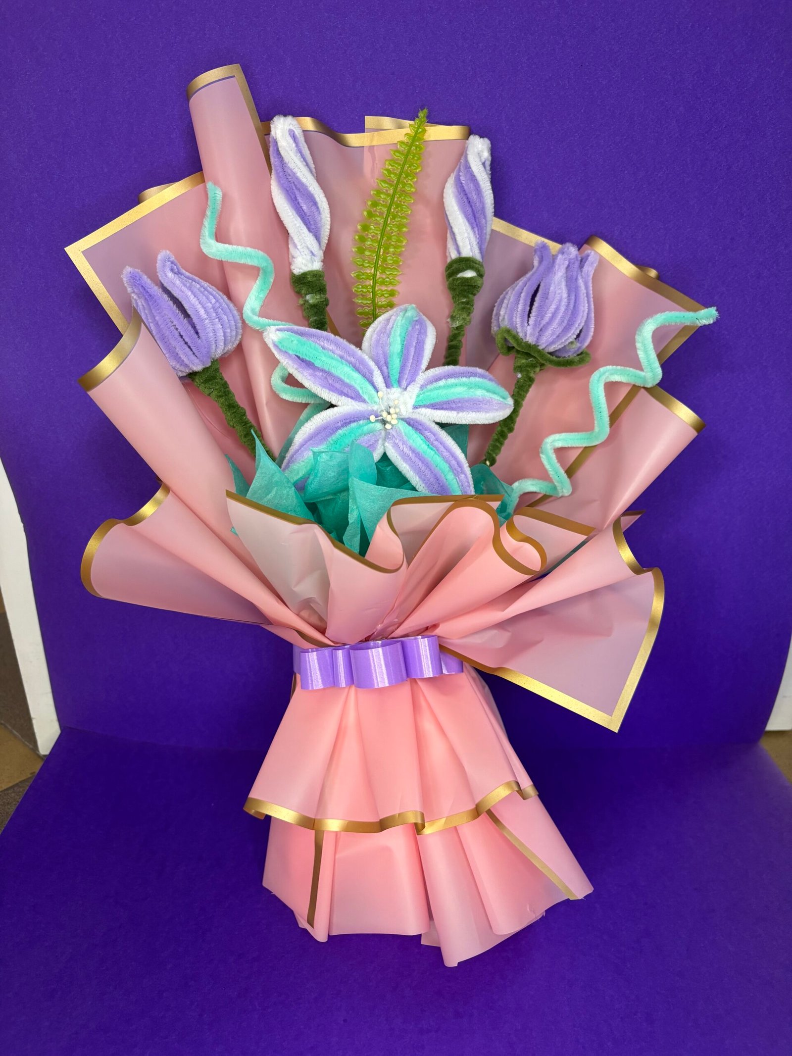 Подарете незабравим и вечен спомен с този уникален букет, създаден с любов и внимание към всеки детайл. Всяко цвете е изработено ръчно от висококачествена, мека и пухкава тел, което придава на букета не само изключителна красота, но и неповторимо усещане при докосване.