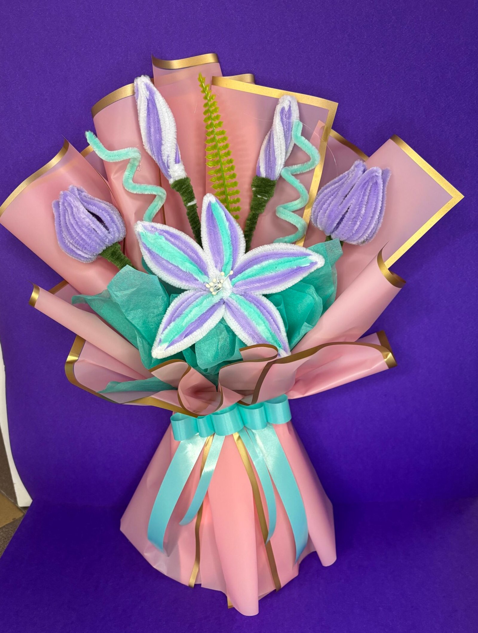 Подарете незабравим и вечен спомен с този уникален букет, създаден с любов и внимание към всеки детайл. Всяко цвете е изработено ръчно от висококачествена, мека и пухкава тел, което придава на букета не само изключителна красота, но и неповторимо усещане при докосване.