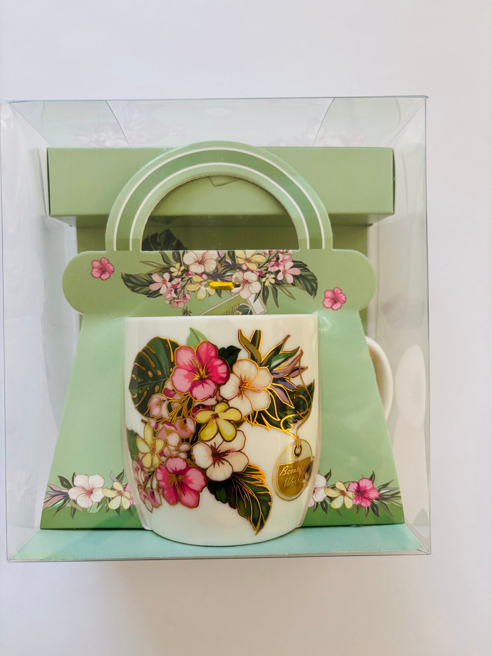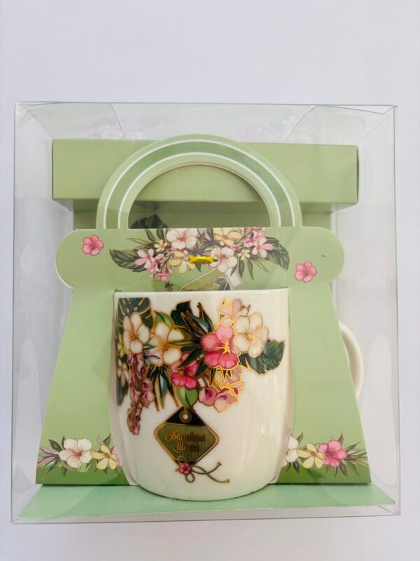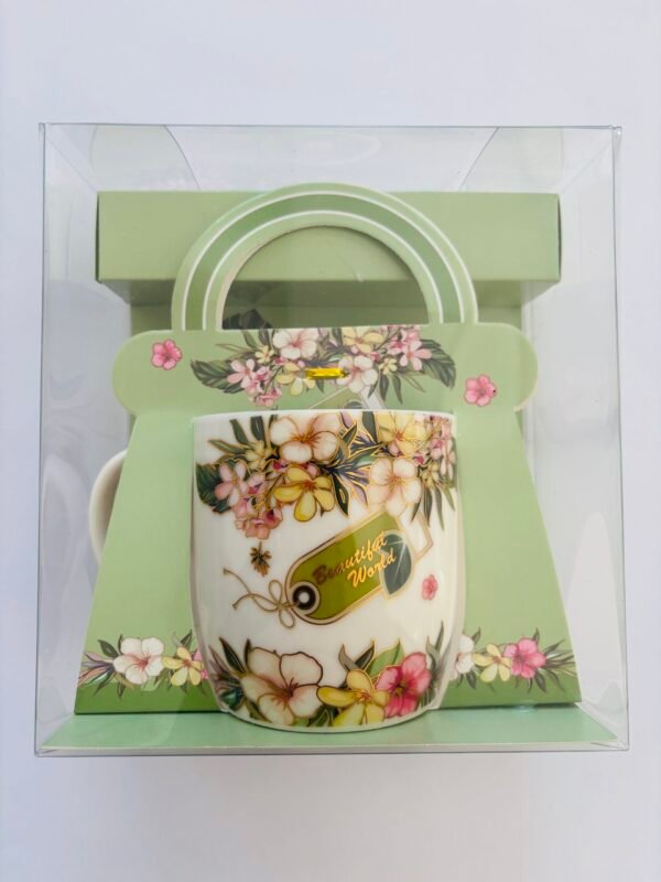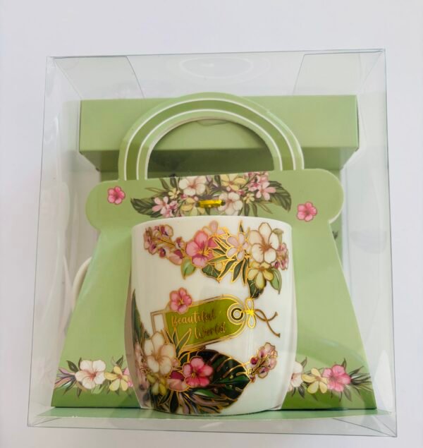 Комплектът е поставен в специална картонена опаковка с форма на чанта, която е в нежен светлозелен цвят. Тази опаковка също е декорирана със същите флорални мотиви, което създава цялостен и хармоничен вид на продукта. Дръжката на “чантата” е оформена с изящни извивки, а в горната част има малък отвор за закачане.
