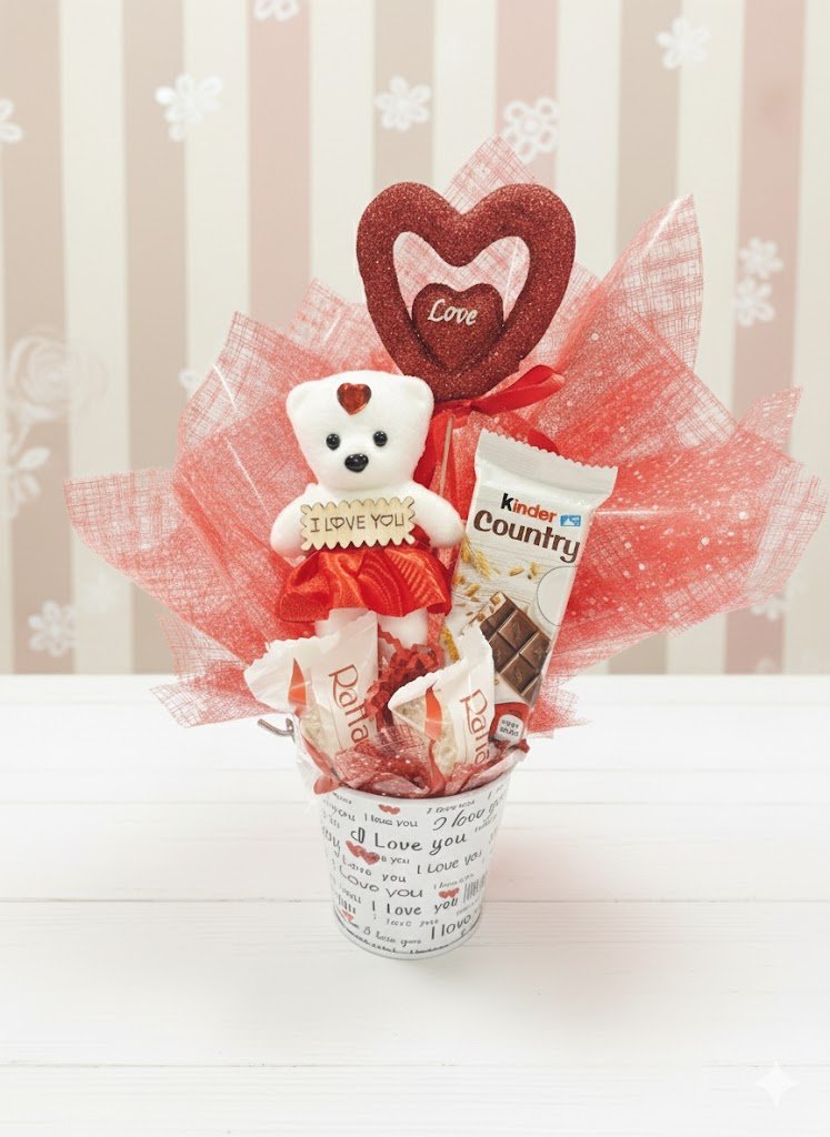 Този продукт е очарователен и романтичен подаръчен комплект, идеален за Свети Валентин, рожден ден или просто като мил жест към любим човек. Композицията съчетава сладост, нежност и празнично настроение в компактен и стилен формат.